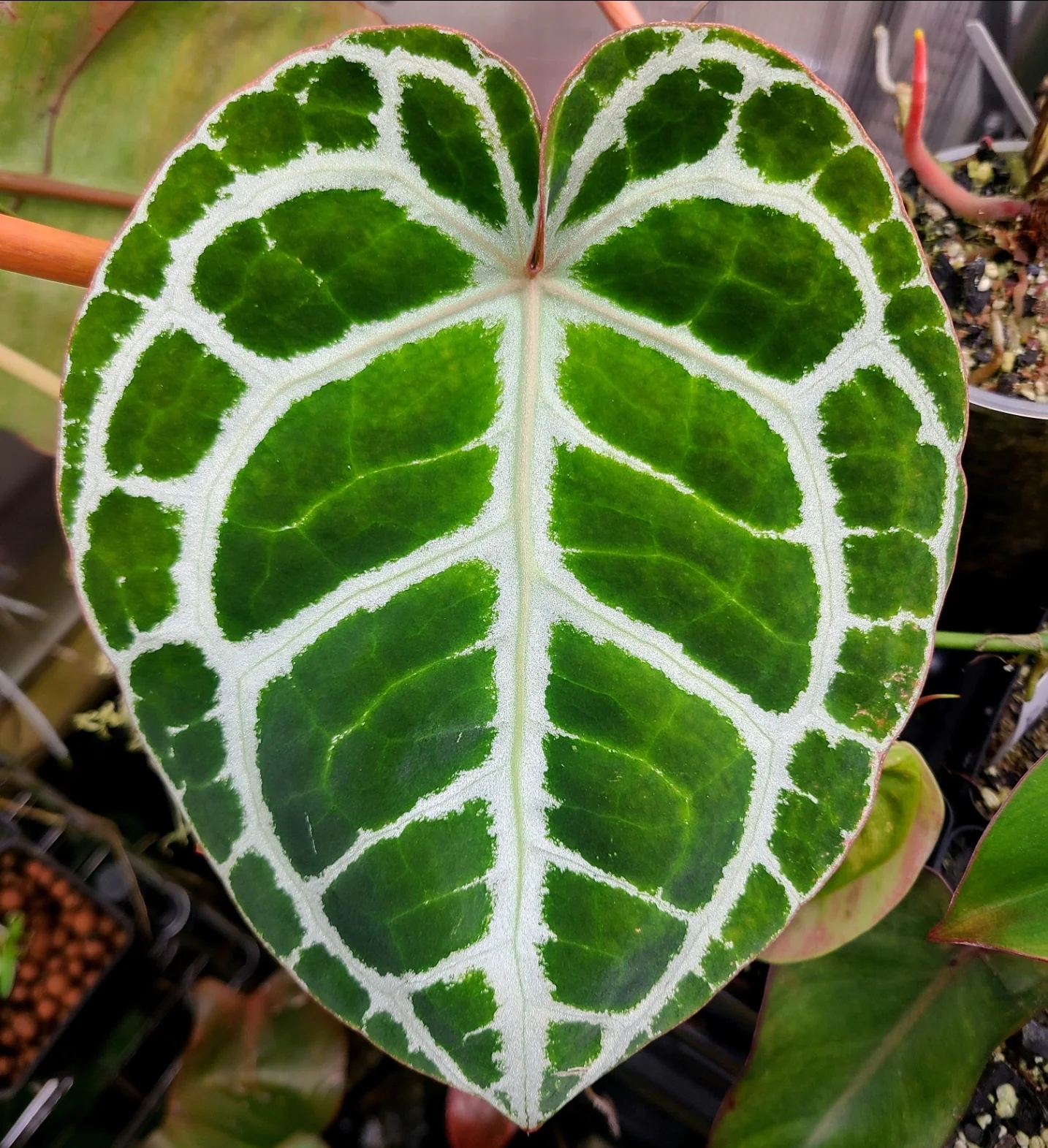 Anthurium crystallinum is a stunning addition to any vivarium due to its silvery velvety leaves and intense pattern contrast. It is native through Central and South America from Panama to Peru, which includes parts of Ecuador and Columbia. It has iridescence and literally looks like glitter was spilled on it. It does well in moderate, indirect light and high humidity. They root relatively easily when their adventitious roots are bundled in moist, but not wet, Sphagnum moss. The leaves can get quite large.