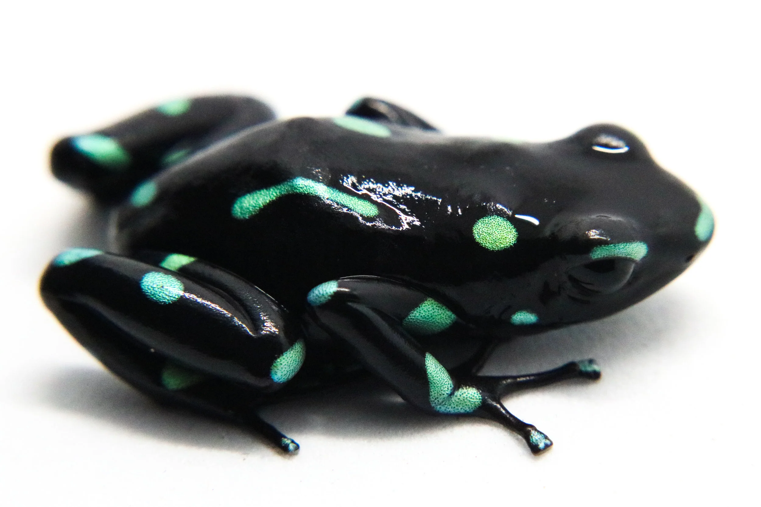 Dendrobates auratus "Ancon Hill" hail from the Ancon Hill region in Panama City, Panama. These are gorgeous frogs that have very dark green / black bodies with metallic light green dots. This frog is moderately shy, and does well in groups. They get bolder with age and exposure, like others of their species. There will be some aggression and wrestling between females, while males do not tend to partake in fighting often. Despite this, you can keep a decently large group of frogs together, even as adults, provided that there are plenty of hiding places and food available. Females will generally lay 4 to 10 eggs under leaf litter or a coconut hut with flat leaves or a petri dish underneath. They will then transport tadpoles to a body of water, like tinctorius. However, you may pull the eggs and raise them yourself. If left alone, the tadpoles will cannibalize. Please let us know if you have any questions. Additional information can be found, of course, through our complimentary Encyclopedia Database: DendroKnow Project.