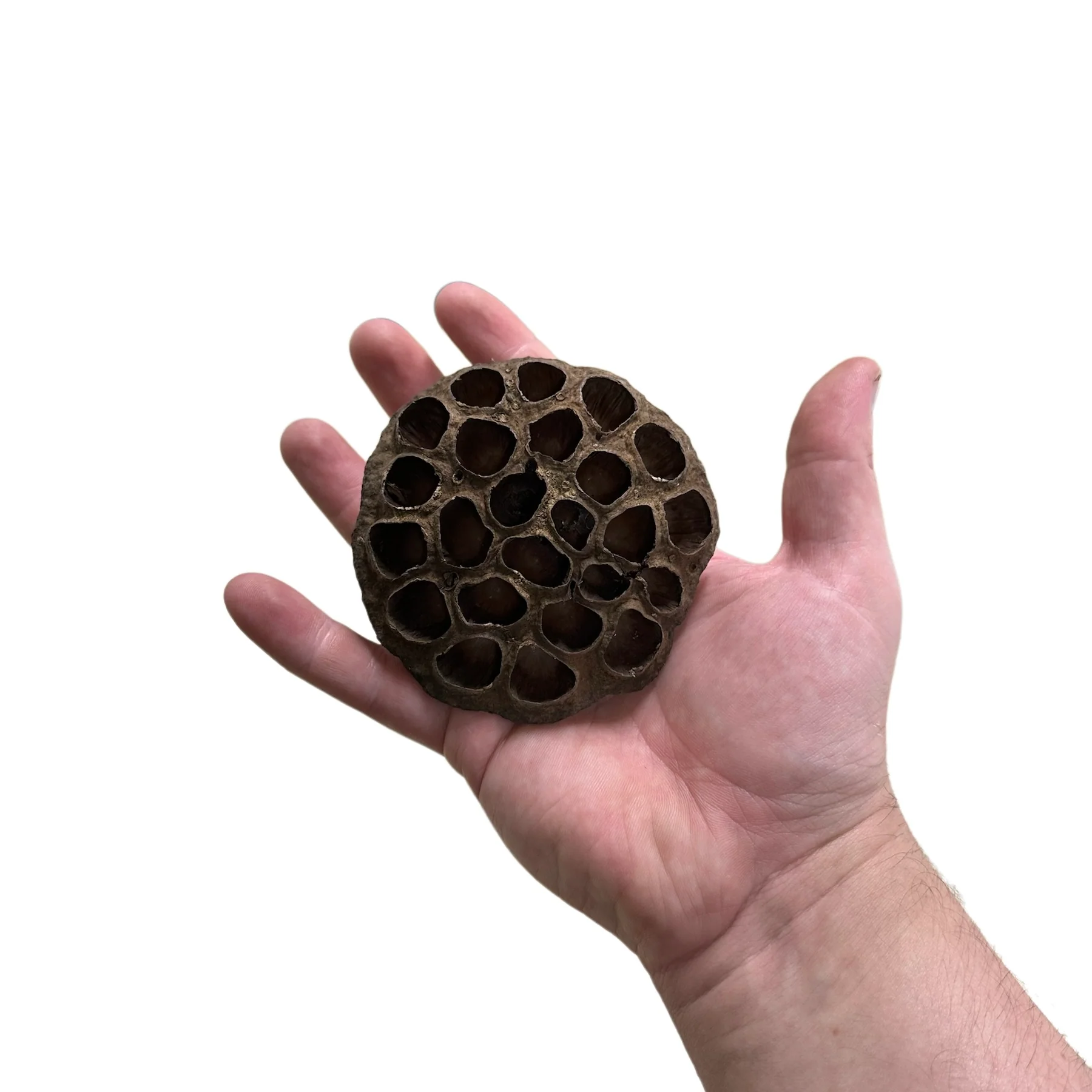 Lotus head seed pods can vary in size and shape, as they are a natural product. Here at FrogDaddy, we use ours toward the backs of our vivariums in clusters of two to three, or in isopod enclosures.